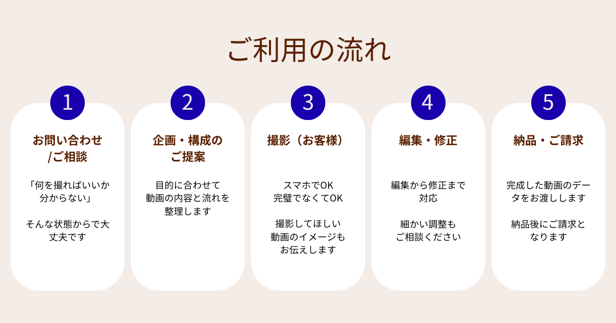 丁寧なヒアリングをもとに、企画・構成 → 編集 → 修正までまとめてサポート。